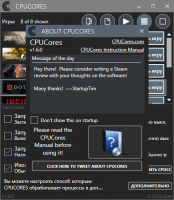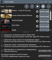 CPUCores являет собой решение для максимального раскрытия потенциала вашего центрального процессора и получения предельной эффективности в компьютерных играх. Программа направляет все силы CPU на функционирование игры, уменьшая значение прочих процессов и служб. Помимо этого, утилита пользуется своими технологиями усиления FPS в играх, которые не могут оптимально работать с имеющими много ядер процессорами. Софт распространяется только на Steam и самостоятельно интегрируется с проектами из этой платформы. Также ПО способно взаимодействовать со сторонними играми и, более того, поддерживает некоторые продукты, требующие значительных мощностей.