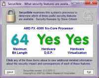 SecurAble – Windows-приложение для проверки производительности центрального процессора. Полученный отчет содержит детальную информацию о чипе, включая модель, поддержку аппаратной виртуализации и совместимость с 64-разрядными системами.