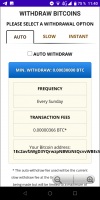 Следует отметить, что эта программа взимает комиссию за автоматический вывод финансов. Каждое воскресенье осуществляется вывод и пользователи могут моментально зачислить выигрыш на криптовалютный кошелёк. Ожидать нужно в течение 10-15 минут, но при этом комиссия будет значительно выше.Дополнительная информация